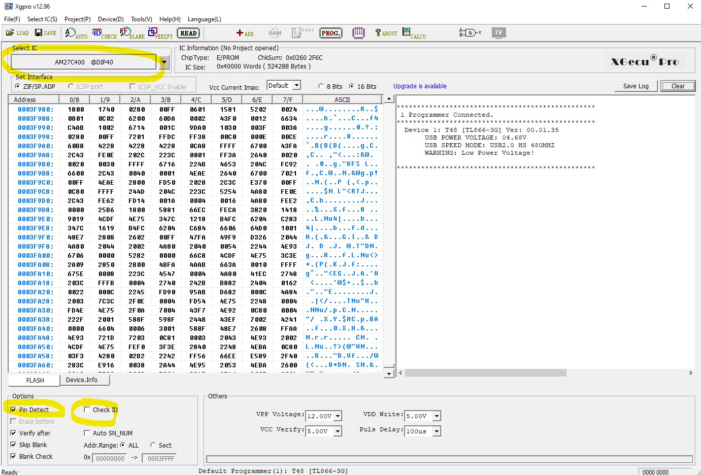 Carichiamo il software Xgpro( se ci viene chiesto scegliamo il T48 come modello di programmatore), colleghiamo il programmatore via USB e se tutto va bene il software ci informa che il programmatore è collegato.